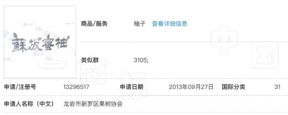 ▶苏坂蜜柚:福建龙岩市新罗区果树协会注册的地理标志集体商标,代表当地优质蜜柚产品。